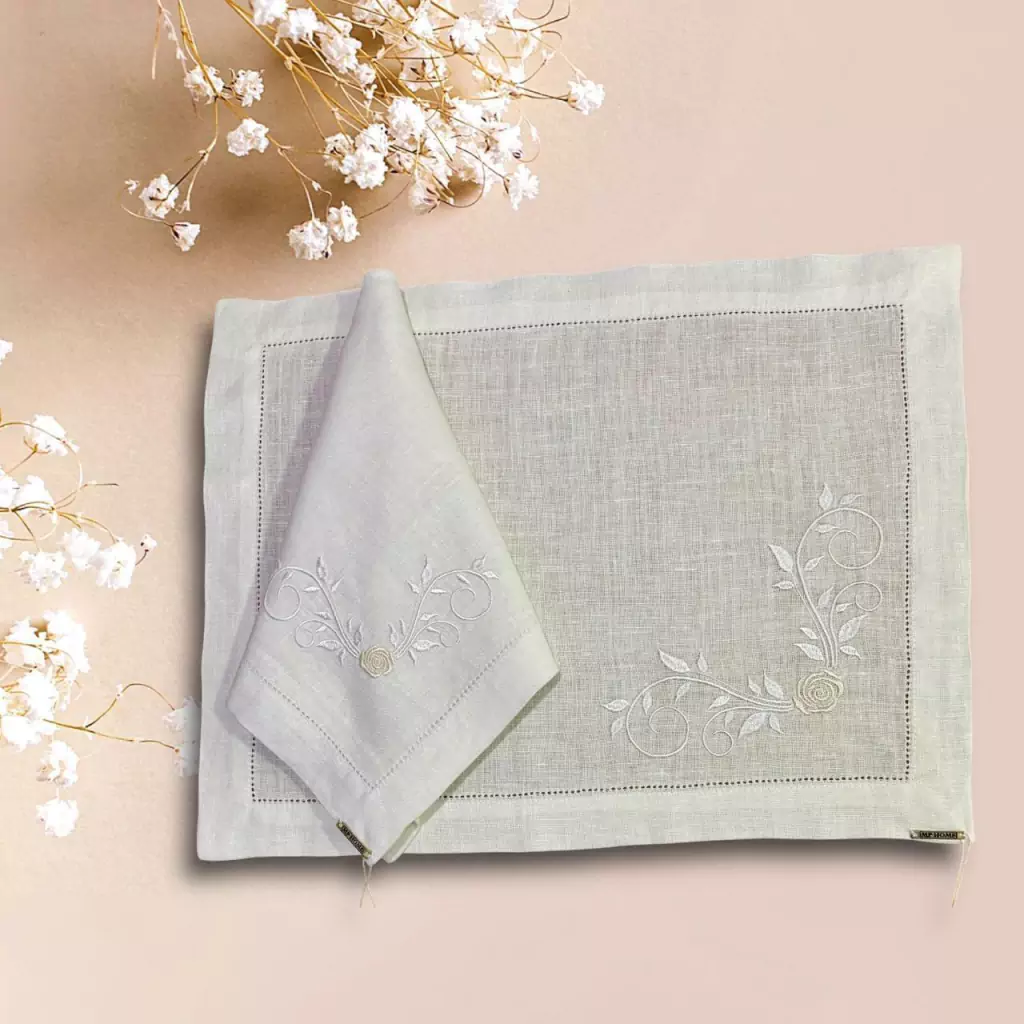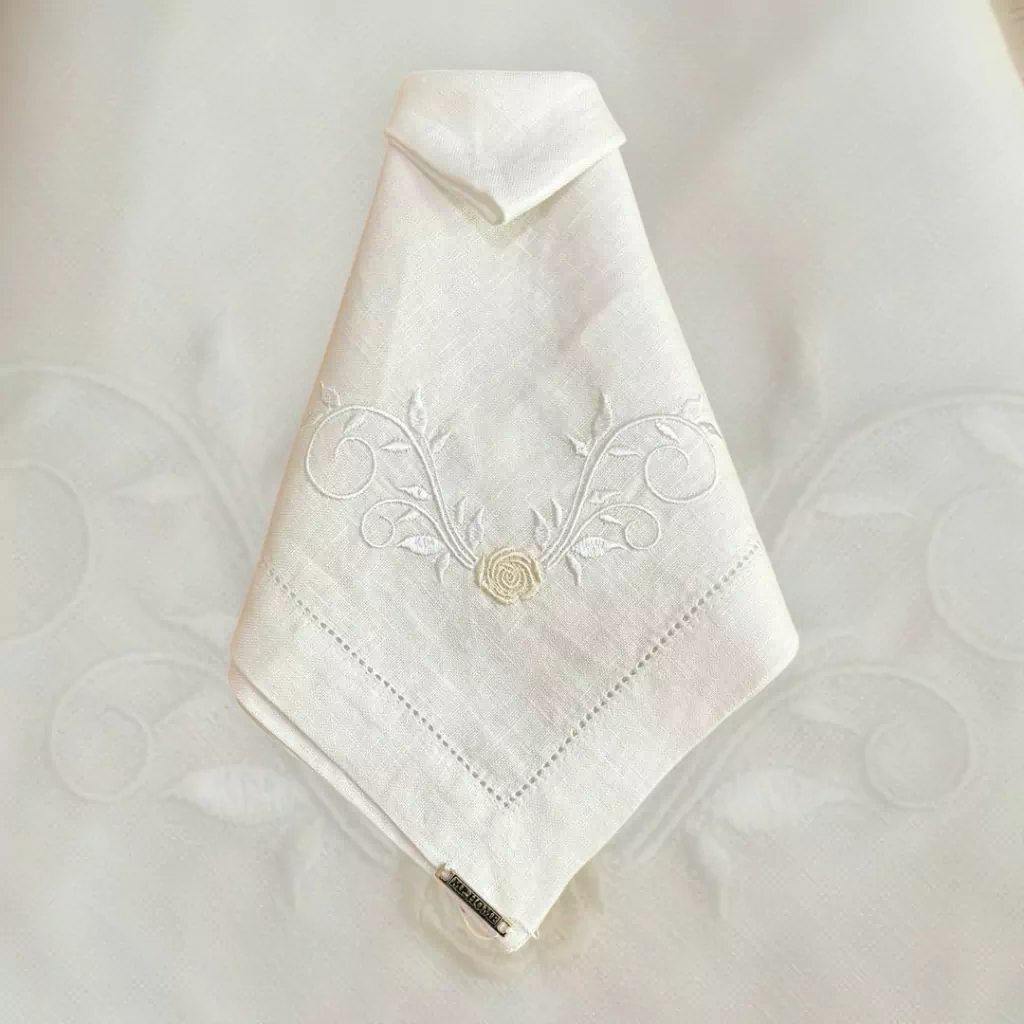 GUARDANAPO CONFECCIONADO EM LINHO PURO COM PONTO AJOUR E BORDADO ROSAS