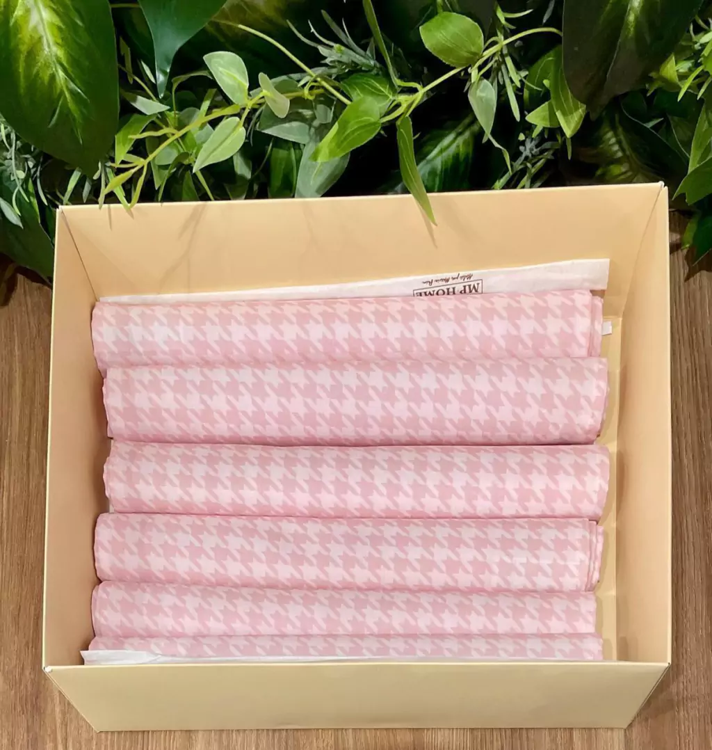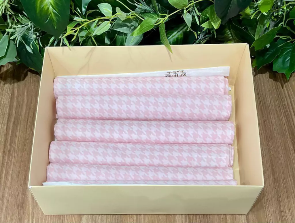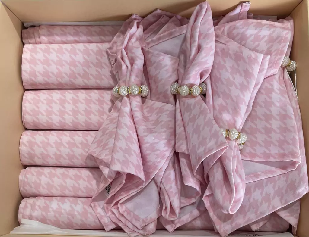 06 GUARDANAPOS CONFECCIONADOS EM TECIDO SINTÉTICO ESTAMPADOS EM TONS DE ROSA E BRANCO MEDINDO 42X42CM CADA