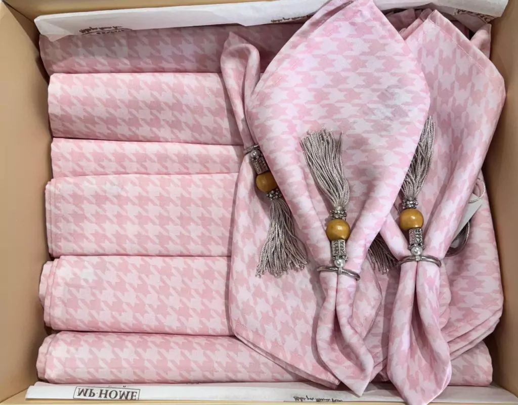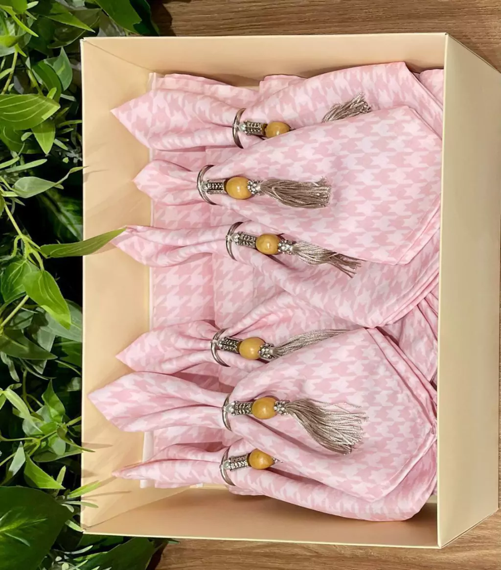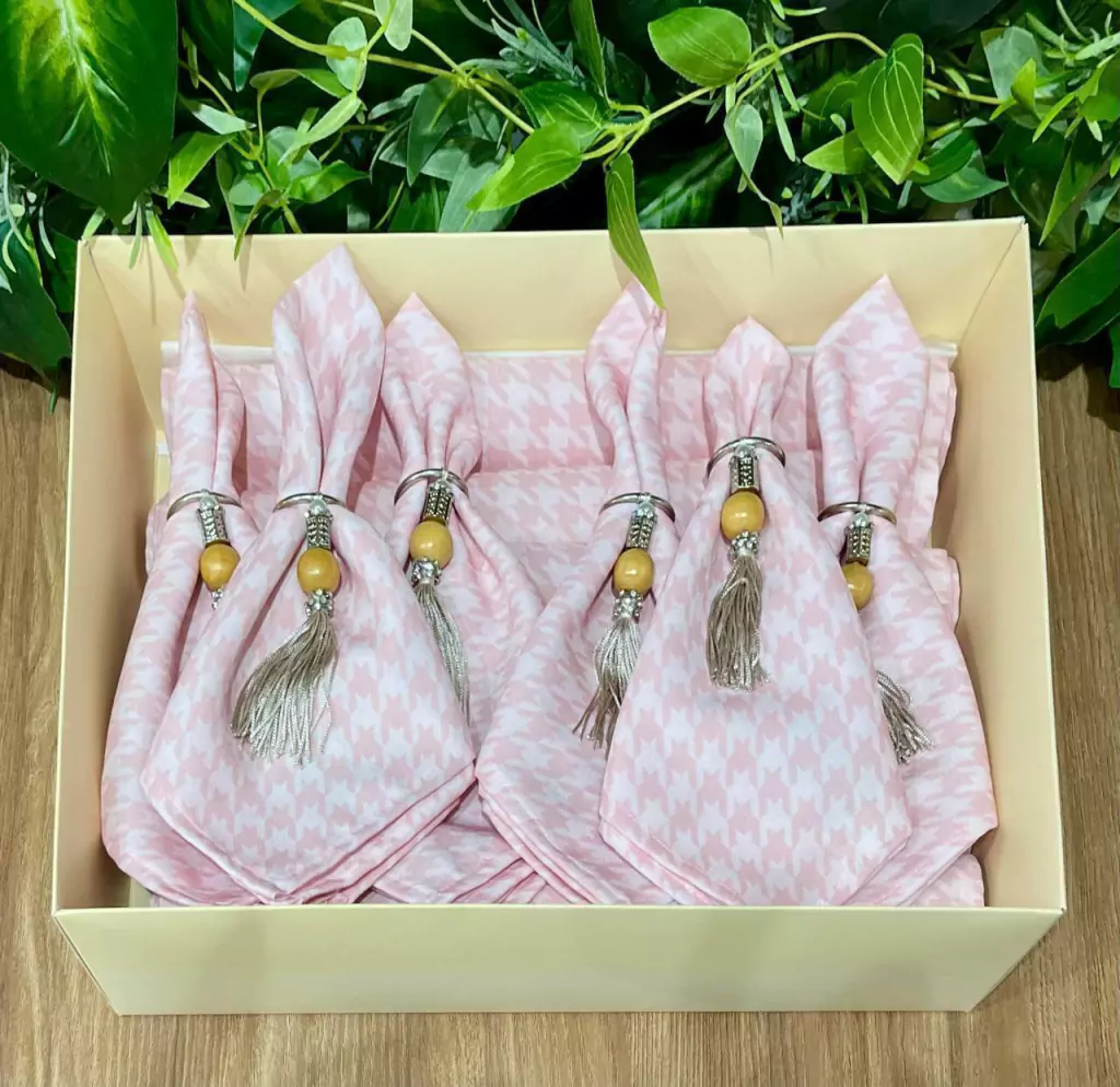 06 GUARDANAPOS CONFECCIONADOS EM TECIDO SINTÉTICO ESTAMPADOS EM TONS DE ROSA E BRANCO MEDINDO 42X42CM CADA