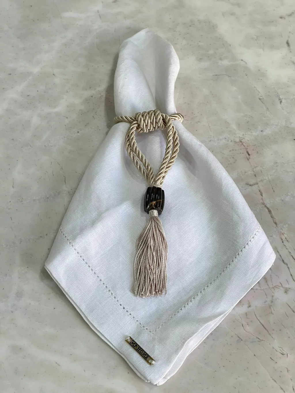 PORTA GUARDANAPO CONFECIONADO EM CORDÃO DE SÃO FRANCISCO RESINA E TASSEL