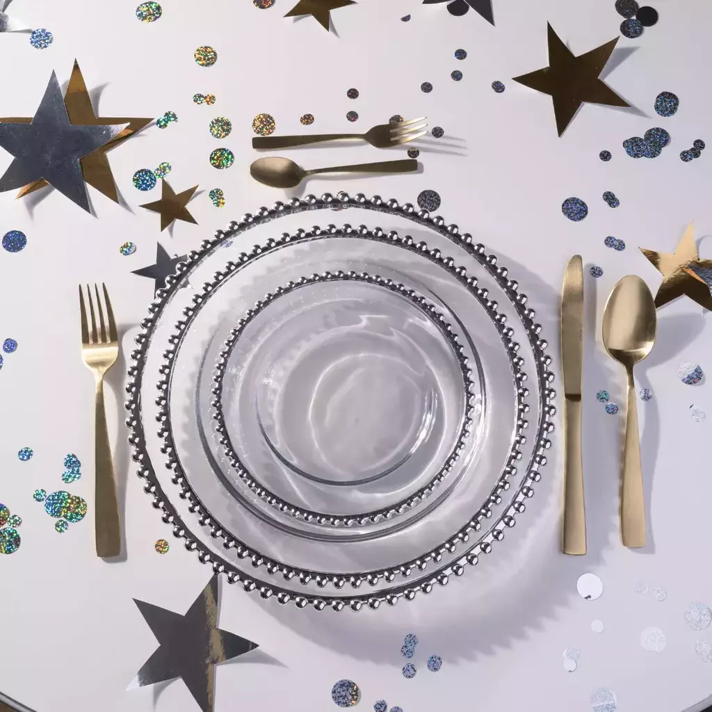 Com detalhes em formato de pérolas, o Prato Sobremesa Cristal com Borda Bolinha Prata Pearl 20 cm é perfeito para organizar e decorar sua mesa posta.