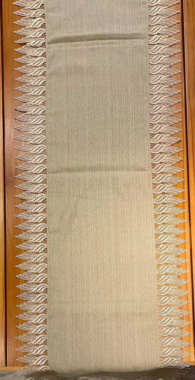 01 TRILHO DE MESA CONFECCIONADO EM LINHÃO RÚSTICO NA COR AREIA COM RENDA GUIPURE