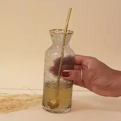 COM UM VIDRO TEXTURIZADO E UM TOM ACIZENTADO QUE TRAZEM UM AR DELICADO E SUA BORDA COM FIO DOURADO QUE TRAZ A ELEGANCIA.