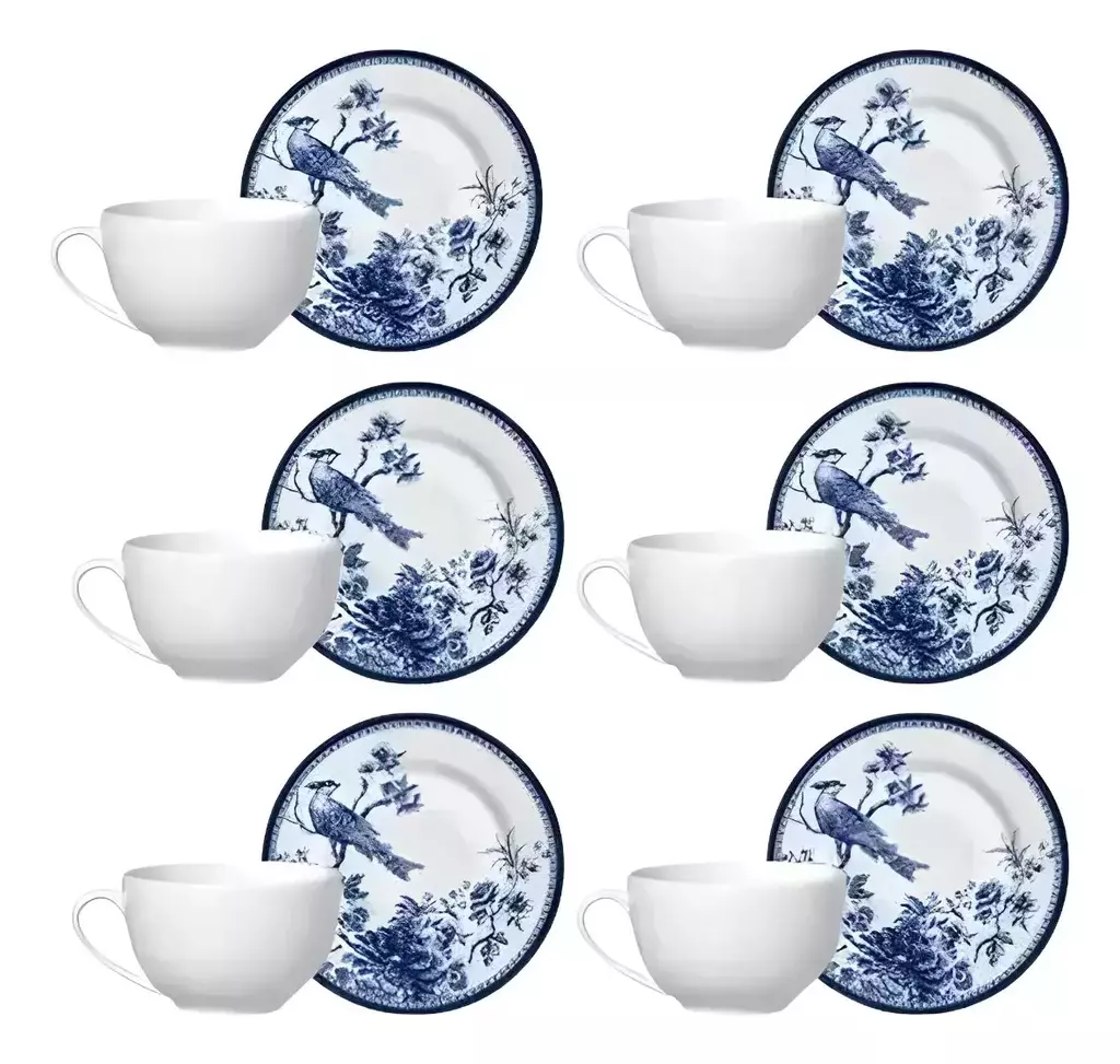 .Xicara De Cha Lisa Branca Com Pires Decorado Chinese Garden Pássaros Mesa Posta Cafe Da Manha Tarde Chá