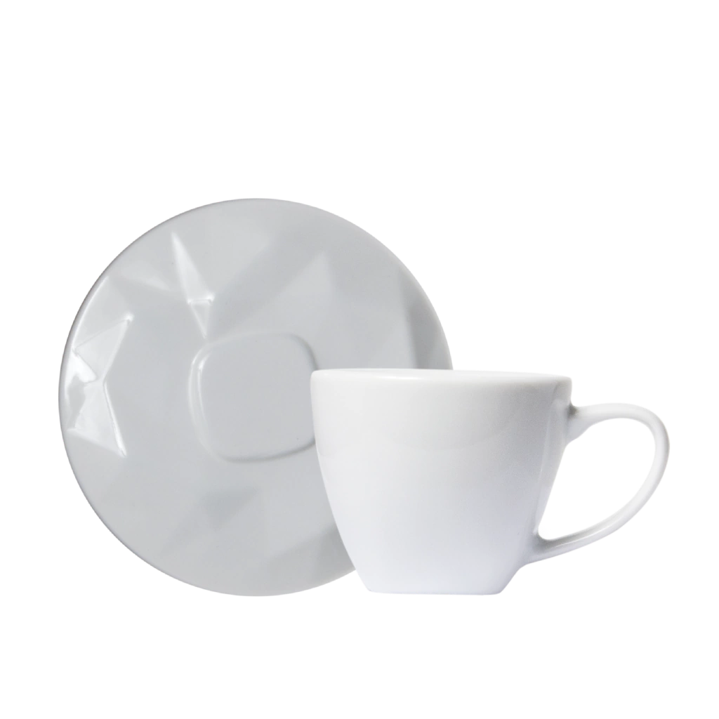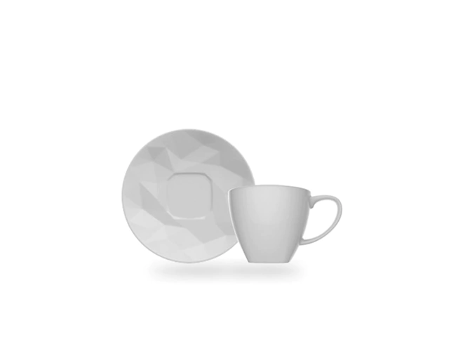 Xícara de Café em porcelana branca, com capacidade para 85 ml, e com pires, Linha Edros Germer. Bonita, prática com design diferenciado, inspirada nas formas geométricas, com relevo irregular, que dá um toque contemporâneo à sua cozinha, é ideal para servir seus convidados e amigos na hora do café.